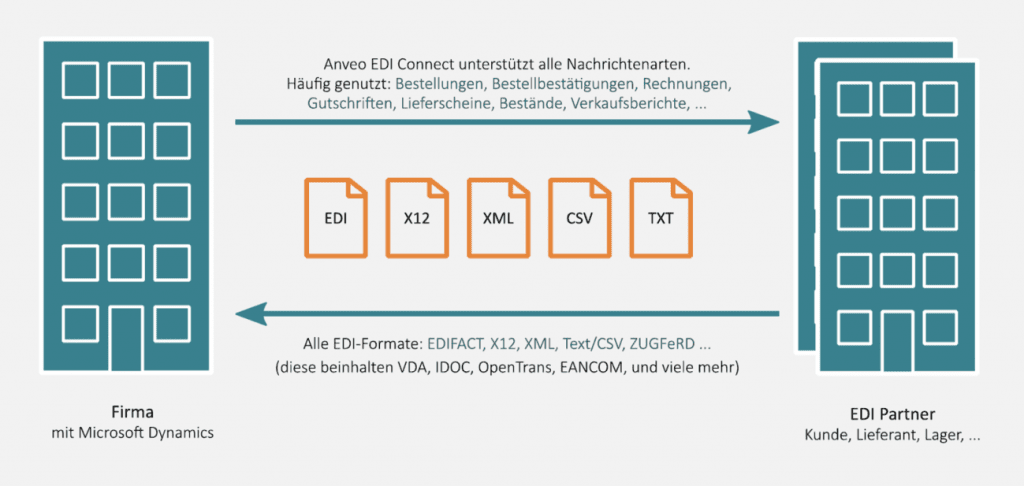 Anveo EDI Connect ist eine in Microsoft Dynamics 365 Business Central (vormals Dynamics NAV) integrierte Lösung, die Ihre Geschäftsprozesse automatisiert und Ihnen den elektronischen Datenaustausch mit Ihren Kunden und Lieferanten ermöglicht.